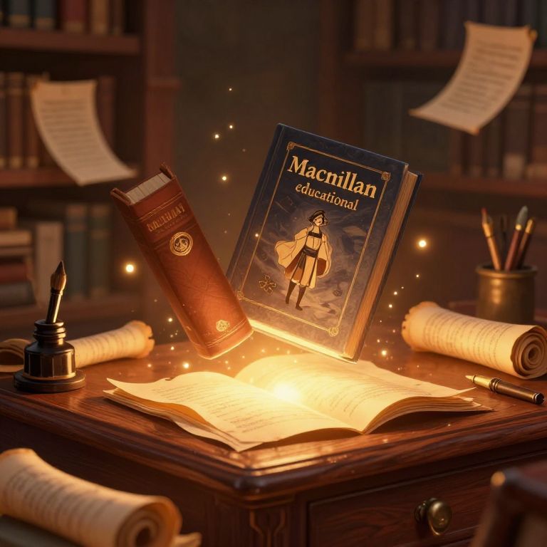 Macmillan educational books floating above an old wooden desk, magical glowing light, ancient scrolls and ink pens around, warm tones, mystical library ambience, fantasy illustration style