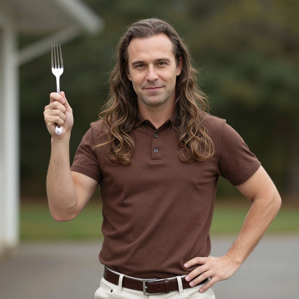 Photograph of a white man with long, wavy brown hair, wearing a dark brown polo shirt and white pants with a black belt. He is holding a white fork in his right hand, raised to shoulder height, and has his left hand on his hip. He has a slight smile and is standing outdoors in a blurred background with greenery and a white structure. The image has a slightly overexposed, surreal quality. The man's confident pose and the unusual prop give the photo a whimsical, humorous feel.