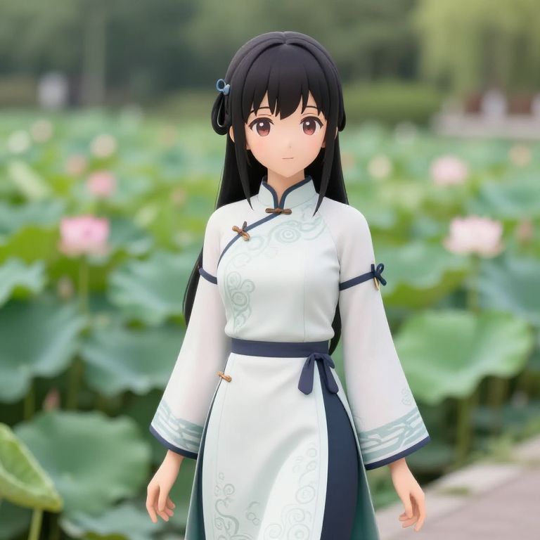 Digital anime-style illustration of a young woman with long black hair, adorned with a blue hairpin, standing in a lush, green garden filled with large lily pads and pink flowers. She has fair skin and large, expressive brown eyes. She wears a traditional white Chinese-style dress with black trim, long sleeves, and a black sash tied at the waist. The background is softly blurred, emphasizing the detailed foreground. The woman's expression is calm and slightly smiling, and she stands with her arms relaxed by her sides. The overall atmosphere is serene and picturesque.