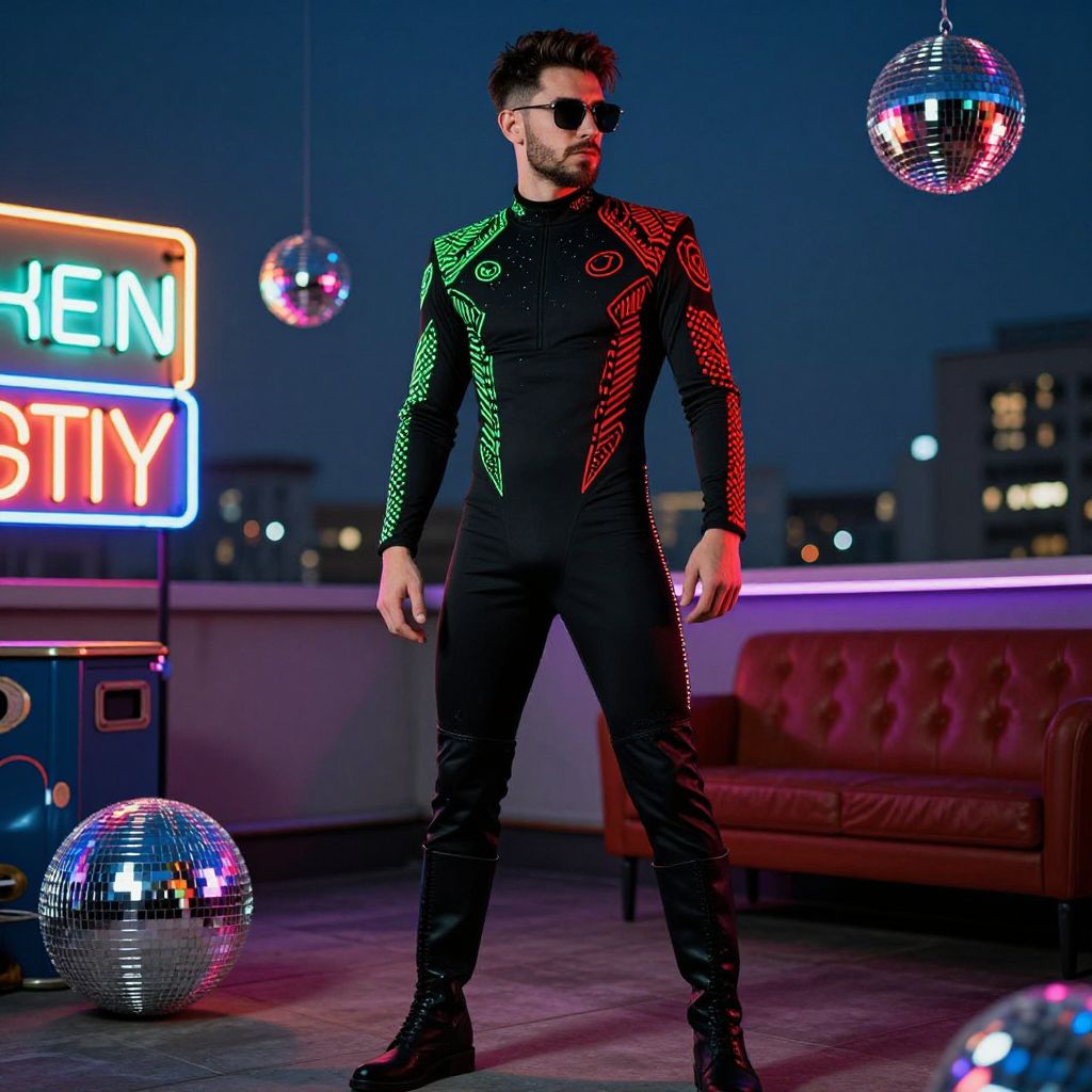 A stylish young man in his early 30s with a rugged beard and dark sunglasses, dressed in a black light party costume featuring glowing green and red patterns on a black bodysuit and knee-high boots, positioned in a vintage-themed rooftop party setting with neon signs and flickering disco balls, the black light illuminating his outfit in a realistic, high-resolution photography style.