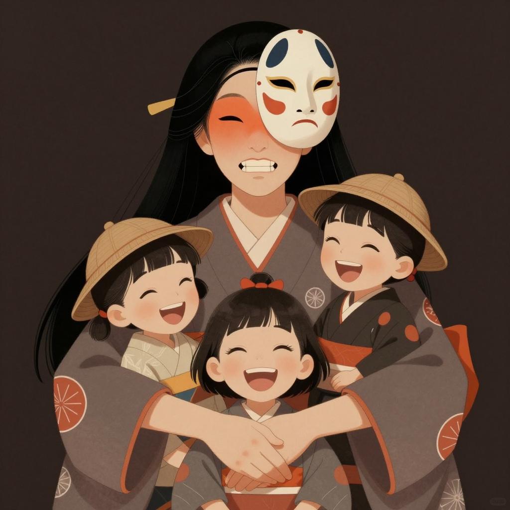 Digital illustration featuring an older Japanese woman with long black hair wearing a gray kimono adorned with red circular patterns. She has a pale face with bright orange makeup and a traditional decorative mask positioned on her head. The woman displays an intense expression showing sharp teeth and large red hands. She embraces two laughing children, both with black hair and pale faces, dressed in traditional Japanese clothing and wearing small woven straw hats. The dark brown background highlights the warmth and cultural details of the subjects' attire.