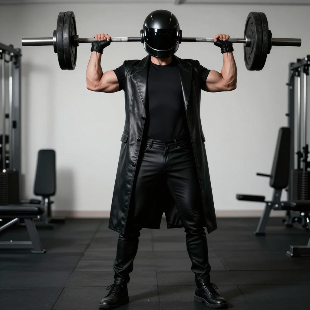 Masterpiece, best quality, high resolution, realistic, handsome, photogenic, syahnk, SFW, a photo of a (35 year old gym frat man:1.2) (full body view:1.6), standing in a gym, (doing military press: 1.3), weights, stunning (hypermuscle biceps: 1.3), looking at the viewer, flirting with the camera, charming, (opened unzipped long black tight leather tuxedo blazer jacket with black tight shirt: 1.9), (GS-Masculine:1), 8K UHD, (futuristic black Daft Punk helmet with black visor, covers mouth:1.7), (tight black leather pants:1.5), (black leather gloves), (black leather gym shoes)