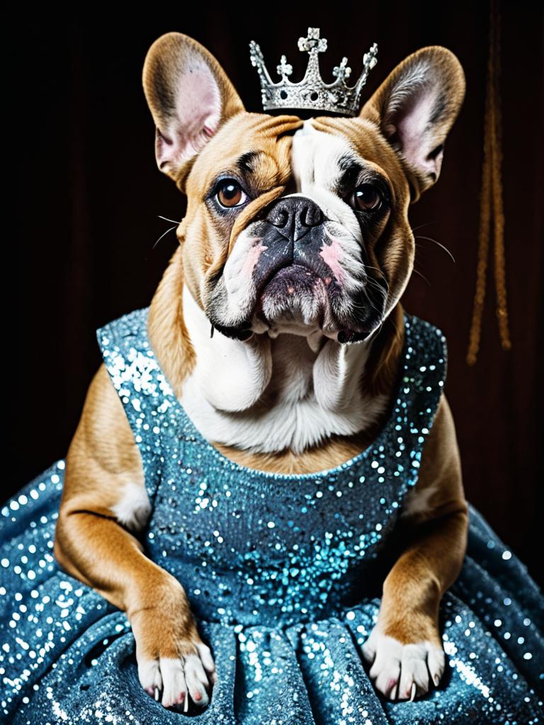 Bulldog in Queen Sparkles Dress, photorealistic humorous costume portrait, cinematic realism
