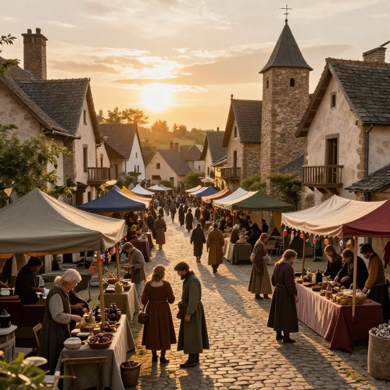 Photograph of a charming, medieval-style market at sunset, with cobblestone street, stone buildings, vendors' stalls, and shoppers in period clothing