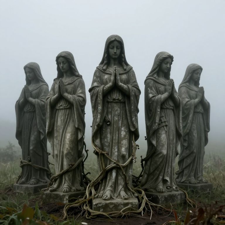 Six cloaked statues stand solemnly in a misty field, their hands clasped in prayer-like gestures, while gnarled vines weave around their bases and cascade down to the ground, creating an eerie interplay between nature and stone.
