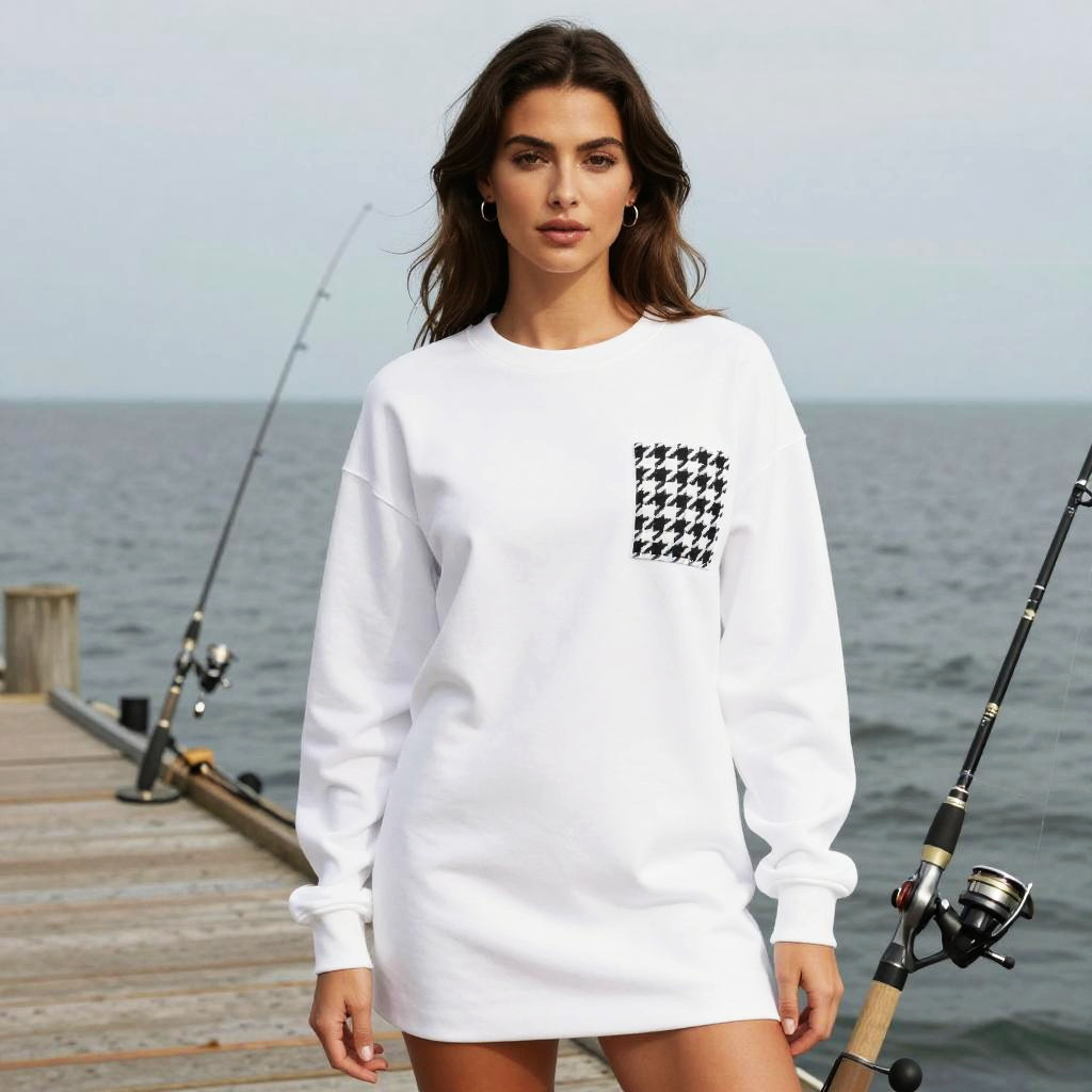 A busty woman in a minimalist white sweatshirt dress with a houndstooth pocket stands at a fishing pier, surrounded by fishing rods. She wears small hoop earrings and has neutral makeup, embodying the visual style of Tuttle Publishing. Sexy. Pretty face and beutiful eyes