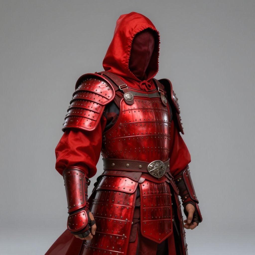 Photograph of a person in full, shiny red samurai armor with a hood. The armor features detailed metal plates with rivets, protective shoulder guards, and a wide belt with a circular metal buckle. The person's face is obscured by the hood, and they stand against a plain, light gray background. The red fabric of the hood and sleeves contrasts with the metallic sheen of the armor, giving a striking visual effect. The overall style is traditional Japanese samurai, emphasizing strength and protection. The image has a realistic, high-contrast lighting.