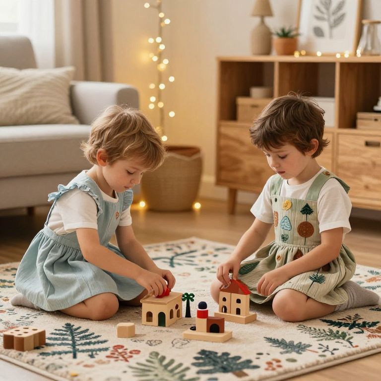 Photograph of two young children, a girl and a boy, playing with wooden blocks on a patterned rug in a cozy living room. The girl, with light brown hair, wears a blue pinafore dress over a white shirt, while the boy, with dark brown hair, wears a green pinafore dress with colorful embroidered designs over a white shirt. Both are kneeling, focused on building a small wooden house. The background includes a grey sofa, wooden shelves, string lights, and a potted plant. Soft, warm lighting fills the room, creating a homely and inviting atmosphere.