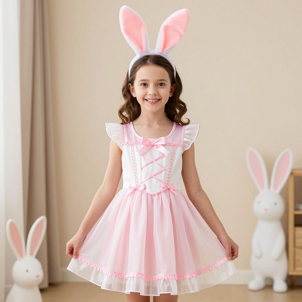 Easter drama costume, girl in a dress with bunny ears and a pink dress