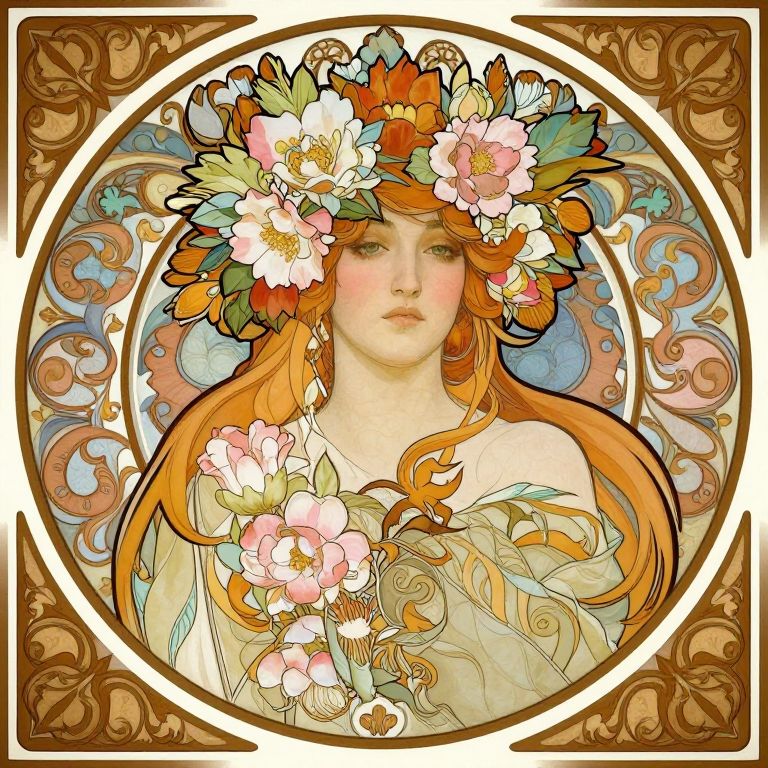 The image is a highly detailed mandala, reminiscent of the work of Alphonse Mucha, featuring a central female figure adorned with a crown of flowers and leaves. The intricate design is encased within a circular frame, with swirling patterns and ornate borders that add depth and dimension. The figure's face is serene, with soft, flowing hair and delicate features, surrounded by a lush array of pink and white flowers. The background is a harmonious blend of warm and cool tones, creating a balanced and visually appealing composition. The interplay of colors, textures, and shapes within the mandala creates a sense of harmony and tranquility, with the central figure serving as the focal point amidst the elaborate and symmetrical design.