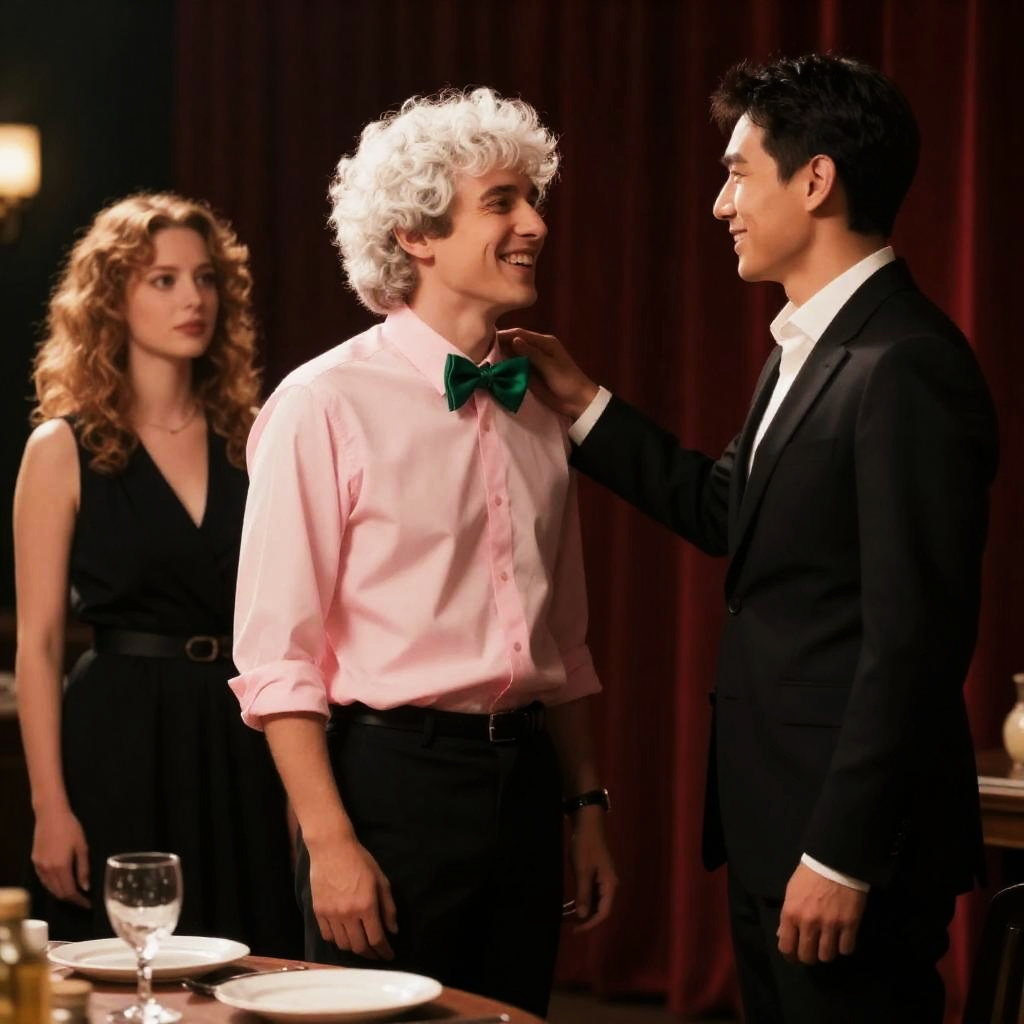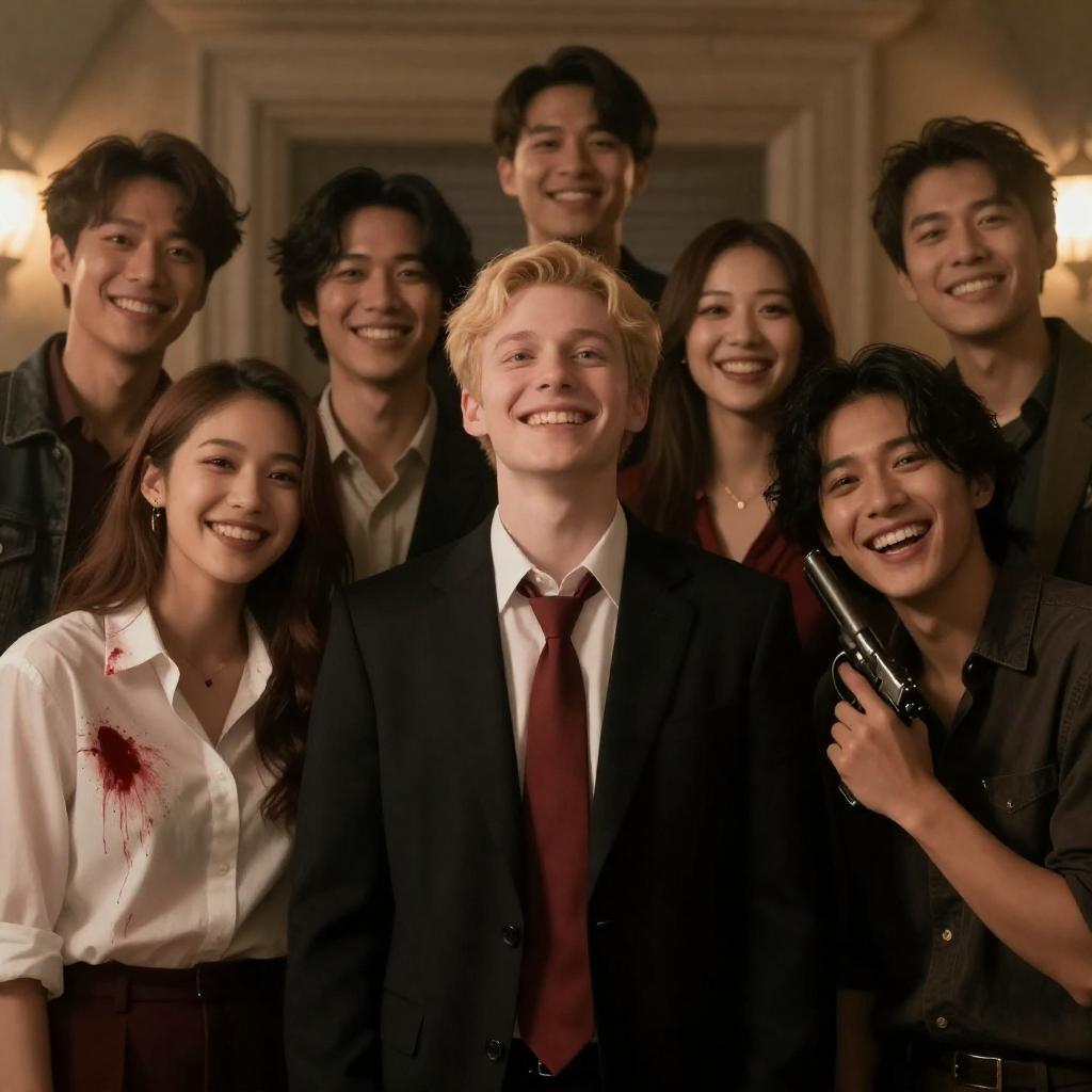 Photograph of four friends with joyful expressions. Two males on the left with curly and straight hair, wearing plaid shirts. One male in the center with Asian features, headband, and open mouth. One female on the right with blonde curly hair, floral dress, and raised arm. Background is blurred with warm lighting. All friends have visible excitement.