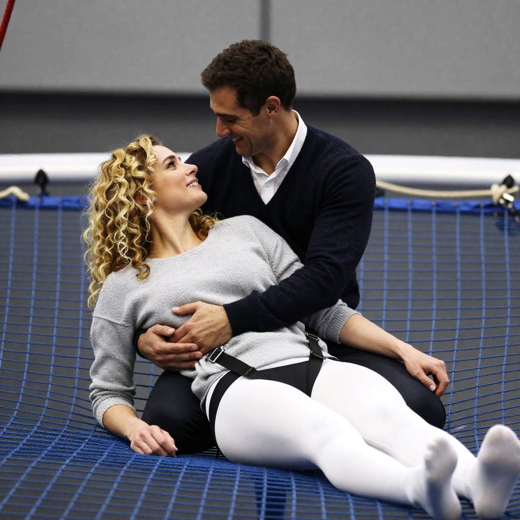Photograph of a man with short brown hair, slightly scruffy, embracing a blonde woman with her back to the camera. She wears a yellow dress with pink patterns. His eyes are closed, expression intense. Background blurred, two people in blue and yellow. Man's right hand on her back, left hand on her shoulder.