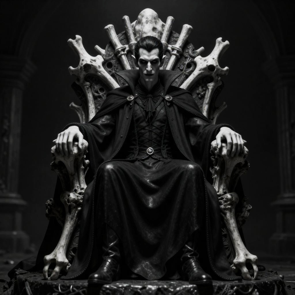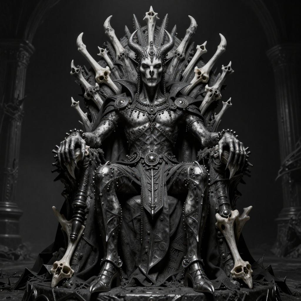 Realistic photo.Environment design of a black-and-white, black metal style portrait by Zbigniew Bielak, depicting a demon prince sitting on a throne of bones, with a void of despair in the background, perspective directly in front of the throne, dark and atmospheric realistic photo
