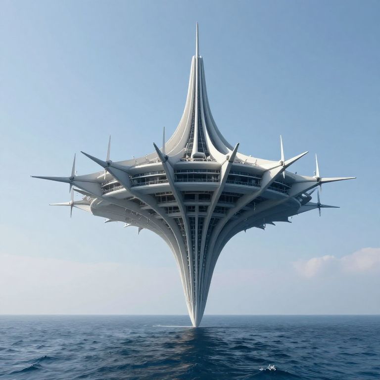 A colossal, asymmetrical structure defies gravity as it floats serenely above the ocean, supported by a single, slender column and adorned with wind-harnessing spires, creating a surreal vision of architectural ingenuity and impossible balance.