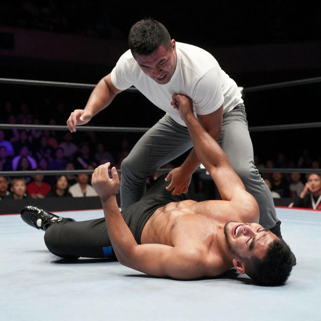 Photograph of two muscular men in a wrestling match. The dominant man with gray hair, wearing red trunks, grips the other man's arm, who has a shaved head and wears a tiger-print loincloth. The dominant man has a strained, intense expression. The background is dark and plain.