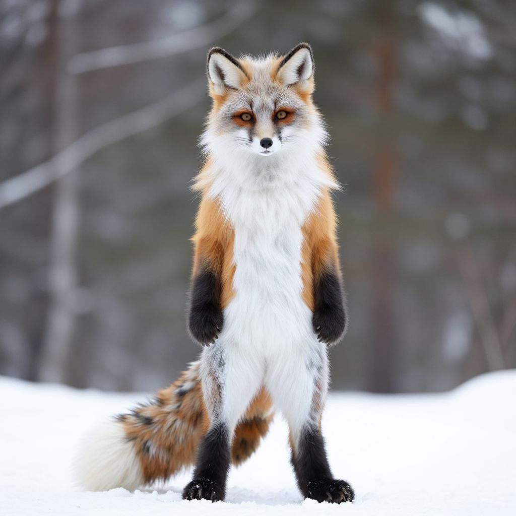 Photograph of a standing red fox in a snowy forest. The fox has a thick, white fur coat with reddish-orange fur on its back, ears, and tail, and black fur on its legs and paws. Its eyes are amber, and it has a black-tipped nose. The background is blurred, showing snow-covered ground and dark, leafless trees. The fox's bushy tail is partially visible behind it. The image is sharp with high contrast, highlighting the fox's vibrant colors against the white snow and dark forest.