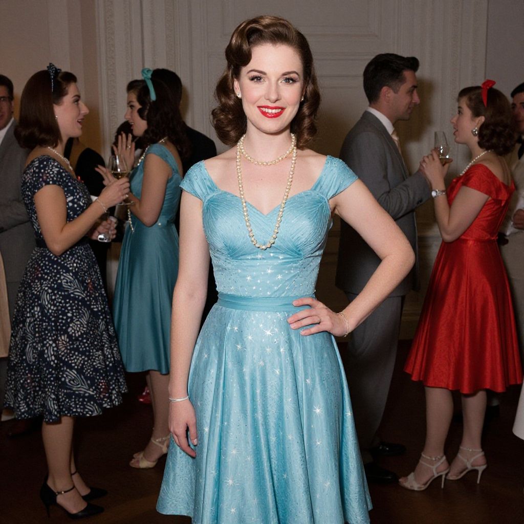 A woman dressed in a retro party dress poses confidently at a themed event, exuding classic 1950s style with her star-patterned blue dress, pearl necklace, and vintage hairstyle. The candid portrait captures the lively atmosphere of the gathering, with elegantly dressed guests in the background.