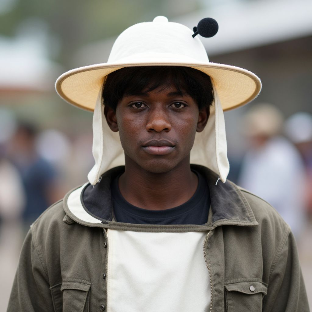"beekeeper costume adult, solo, 1boy, male focus, blurry background, looking at viewer, blurry, outdoors, dark-skinned male, realistic, dark skin, upper body, closed mouth, asian, jacket, hat, black hair Realistic photo of casual sexy person with pretty face"