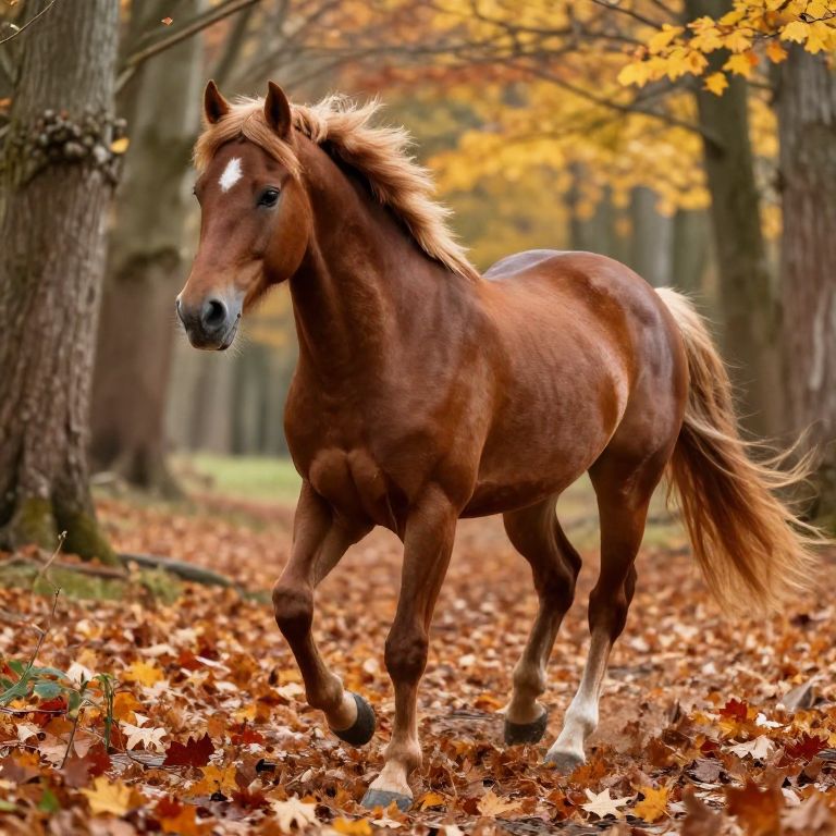 Hafling horse trotting through a forest trail blanketed with fallen autumn leaves, golden and reddish hues reflecting off its shiny chestnut coat, serene atmosphere, hyperrealistic texture and depth.