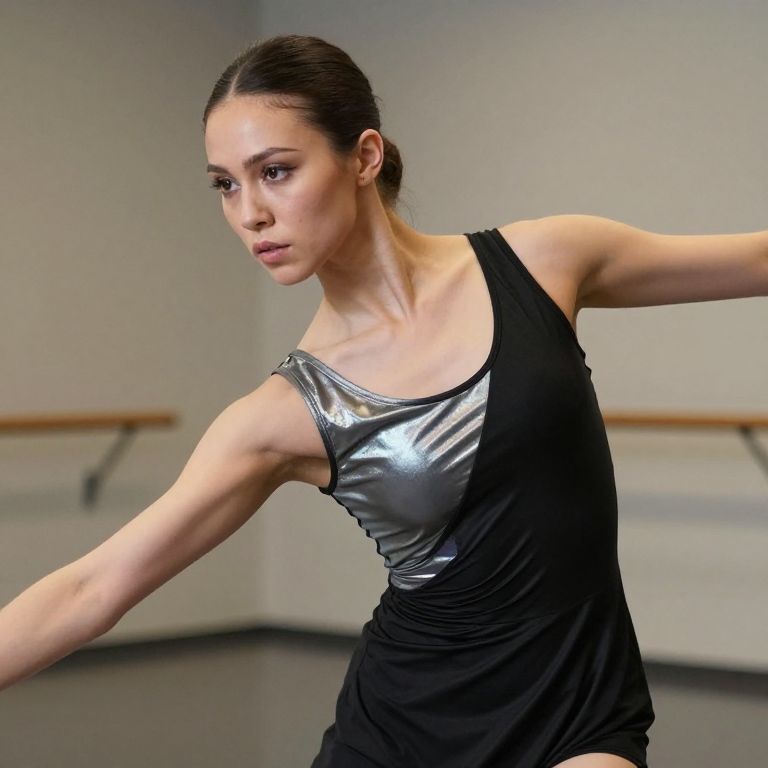 A studio portrait of a dynamic female dancer in her early 30s with defined cheekbones, almond-shaped eyes, and a slightly tired yet focused expression, wearing a modern, minimalist contemporary dance dress with deep black base and iridescent silver accents, set in a professional rehearsal room with neutral tones and soft ambient lighting.
