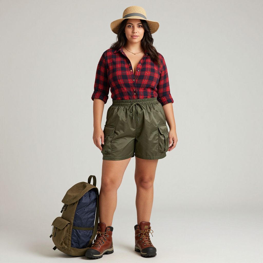 Full body shot, Pear-shaped body type woman, lightweight flannel shirt, red and black plaid pattern, rolled-up sleeves, breathable cotton fabric, fitted at the waist, loose at the hips, high-waisted cargo shorts, olive green, durable ripstop nylon, multiple pockets, adjustable drawstring, sturdy hiking boots, brown leather, waterproof, cushioned soles, wide-brimmed sun hat, straw material, stylish yet functional, layered with a lightweight windbreaker, navy blue, packable, quick-dry material, accessorized with a canvas backpack, earthy tones, practical and chic. Sexy. Pretty face and beаutiful eyes. Big breasts