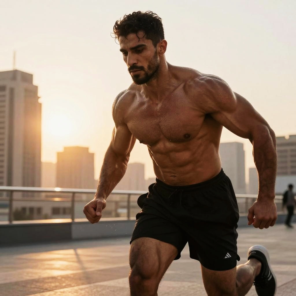 Arab bodybuilder performing intense workout outdoors with cityscape background, dynamic motion blur, sweat and effort visible, glowing sunset light juxtaposed with urban environment