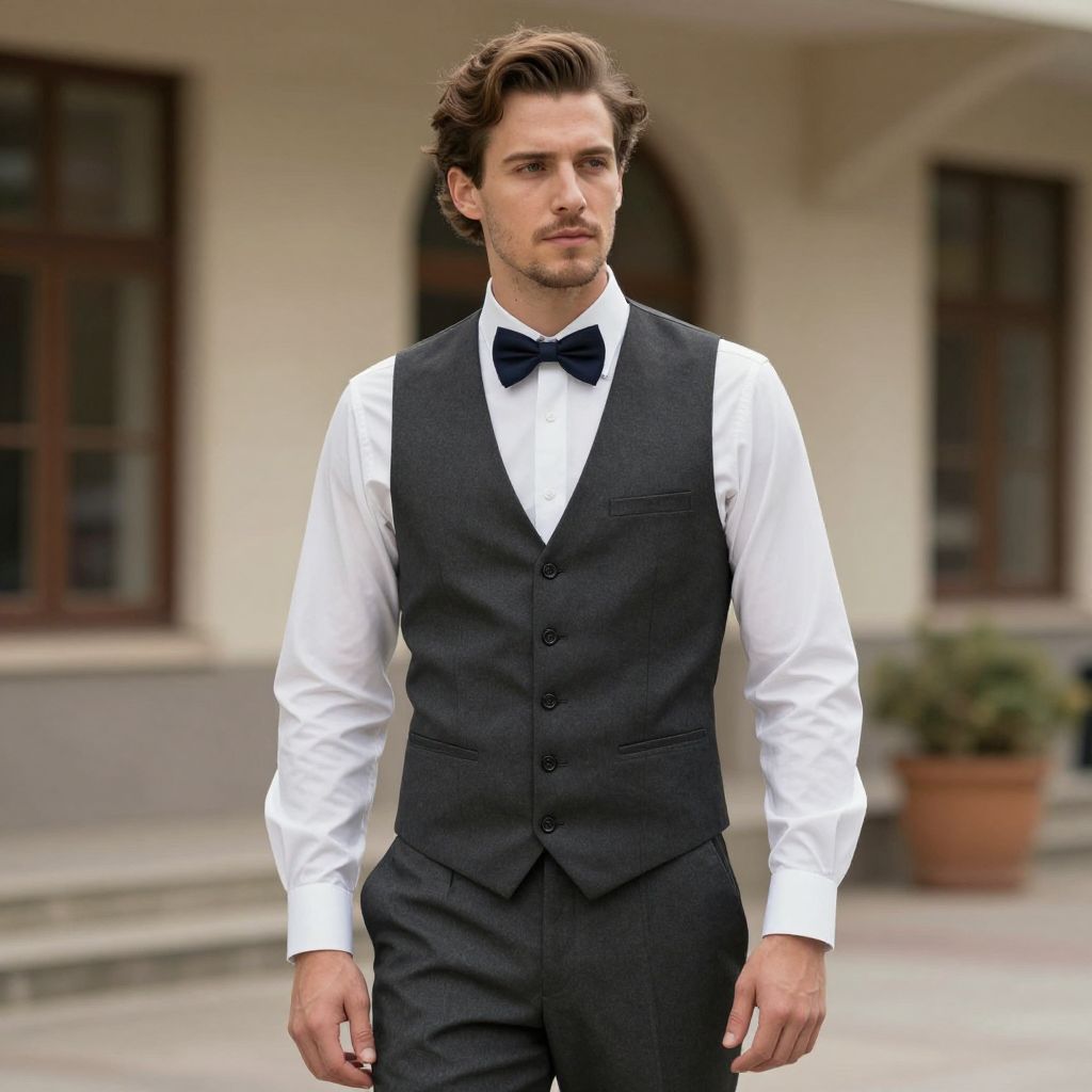 Retro Style Man Clothing Costume, man in a vest and bow tie standing in front of a building