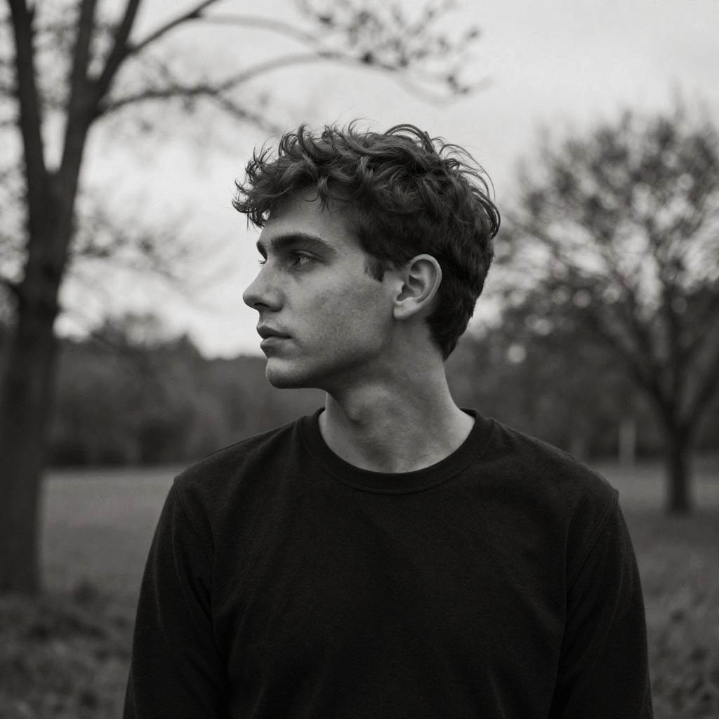 Man with dark hair, medium build, wearing a brown vest over a beige shirt, plays a dark wooden piano. Hands raised, fingers poised over keys. Warm light from a red lampshade illuminates the scene. Decorative, patterned curtains in background. Music sheets on piano stand. Intense focus on face. Piano keys and bench visible.