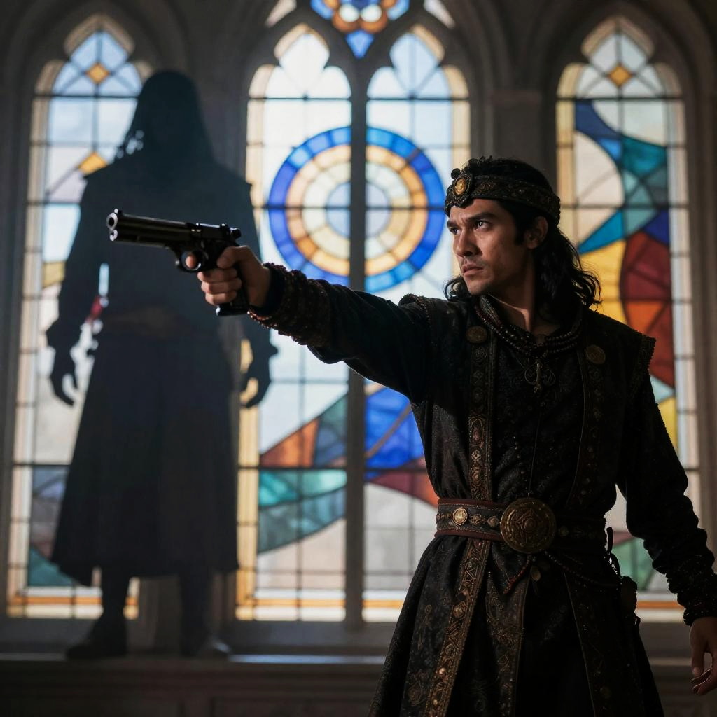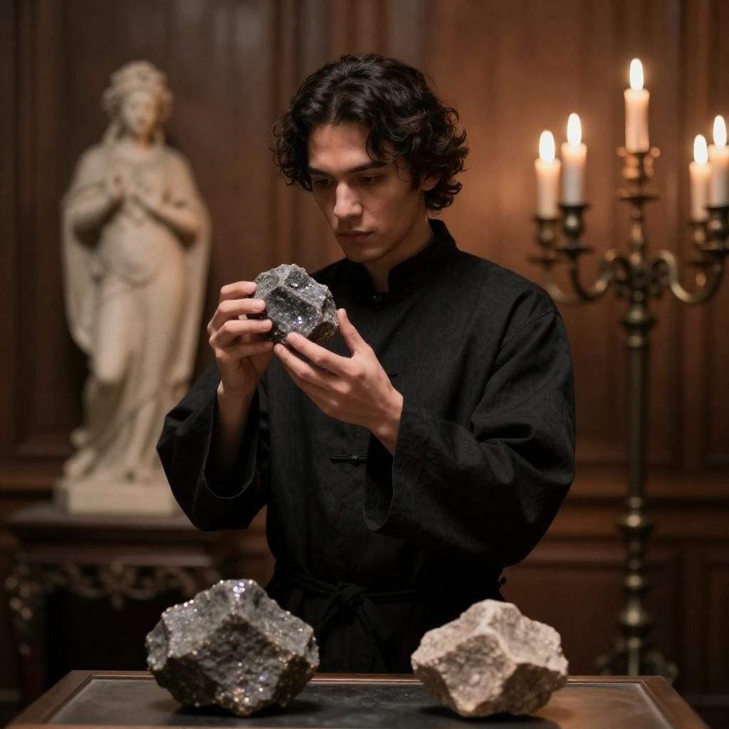Photograph of a dark-haired man in a black robe, holding a glittering rock, examining it closely. Dimly lit room with wooden walls, a large candelabrum with lit candles on the right, and a statue in the background. Two rocks on a table in front. Intense focus on the rock.