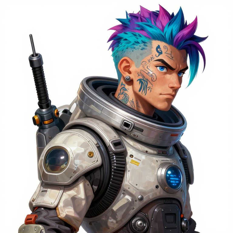 Doodle RPG Character in Cyberpunk style but in a space suit, very detailed with facial tattoos, colorful hair, side profile, white background,