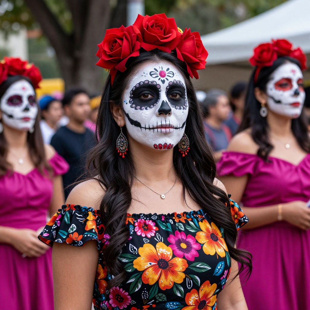 Vibrant Day of the Dead celebration showcases a woman adorned with intricate sugar skull makeup, a striking red rose crown, and a colorful floral dress, surrounded by similarly dressed participants in a festive outdoor setting.