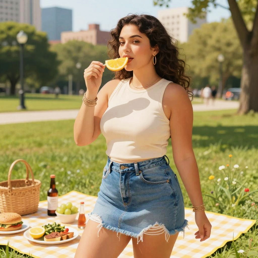 A Curvy woman in a casual summer outfit, light beige sleeveless top and a frayed high-waisted denim mini skirt, layered bracelets, enjoying a picnic feast in a city park, illustrated in the vibrant style of Shueisha. Sexy. Pretty face and beutiful eyes