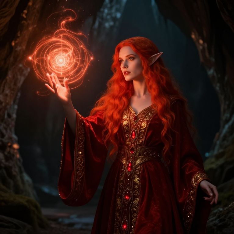 Red haired elf female mage casting a spell in a dark mystical cave, vibrant red hair glowing softly, long ornate robes embroidered with gold and ruby patterns, swirling magical energy forming intricate symbols, atmospheric fantasy illustration.