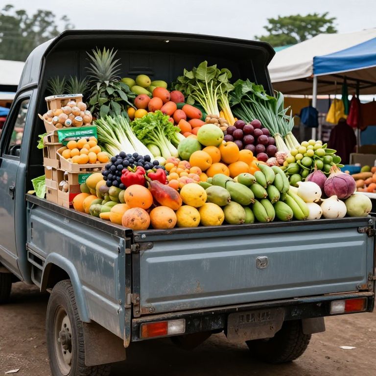 A truckload of exotic fruits and vegetables overflowing from an old-fashioned open-bed truck parked in a bustling farmers market, rich in detail and color, showcasing the abundance and variety of a lively rural harvest scene.