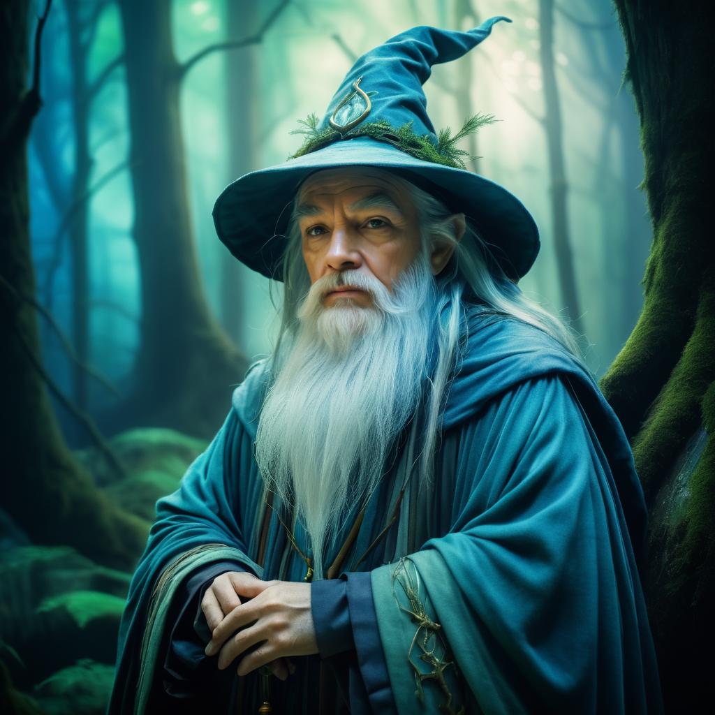 A highly detailed, realistic dark fantasy scene depicting an ancient wizard sitting on a bed in a rustic, dimly lit bedroom. The wizard wears weathered robes and a pointed hat, holding a wooden staff emitting a bright, mystical blue glow. The room features antique furniture, framed paintings on the walls, and warm candlelight, enhancing the cinematic atmosphere.