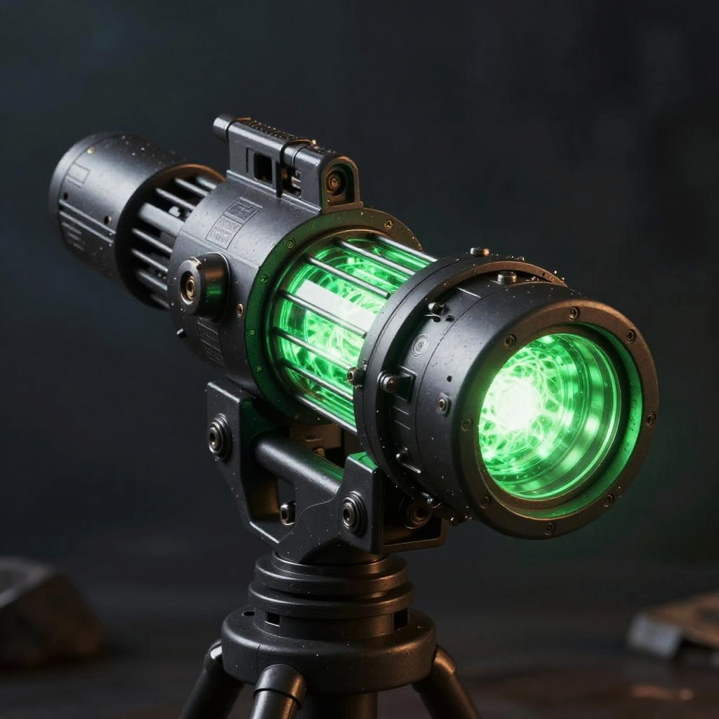 Concept Star Wars blaster rifle, heavy-duty artillery with glowing green plasma chamber, intense close-up shot, dark smoky environment, detailed mechanical parts, realistic render