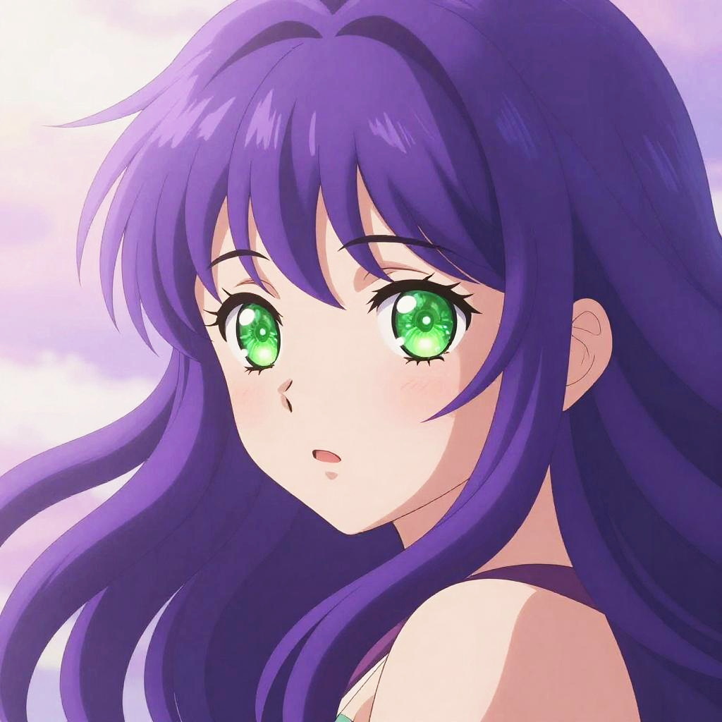 Purple hair green eyes anime style close-up, expressive and vibrant colors, dynamic hair flowing, sparkling emerald eyes, soft blush on cheeks, detailed shading, dreamy pastel background, high detail, fantasy illustration.
