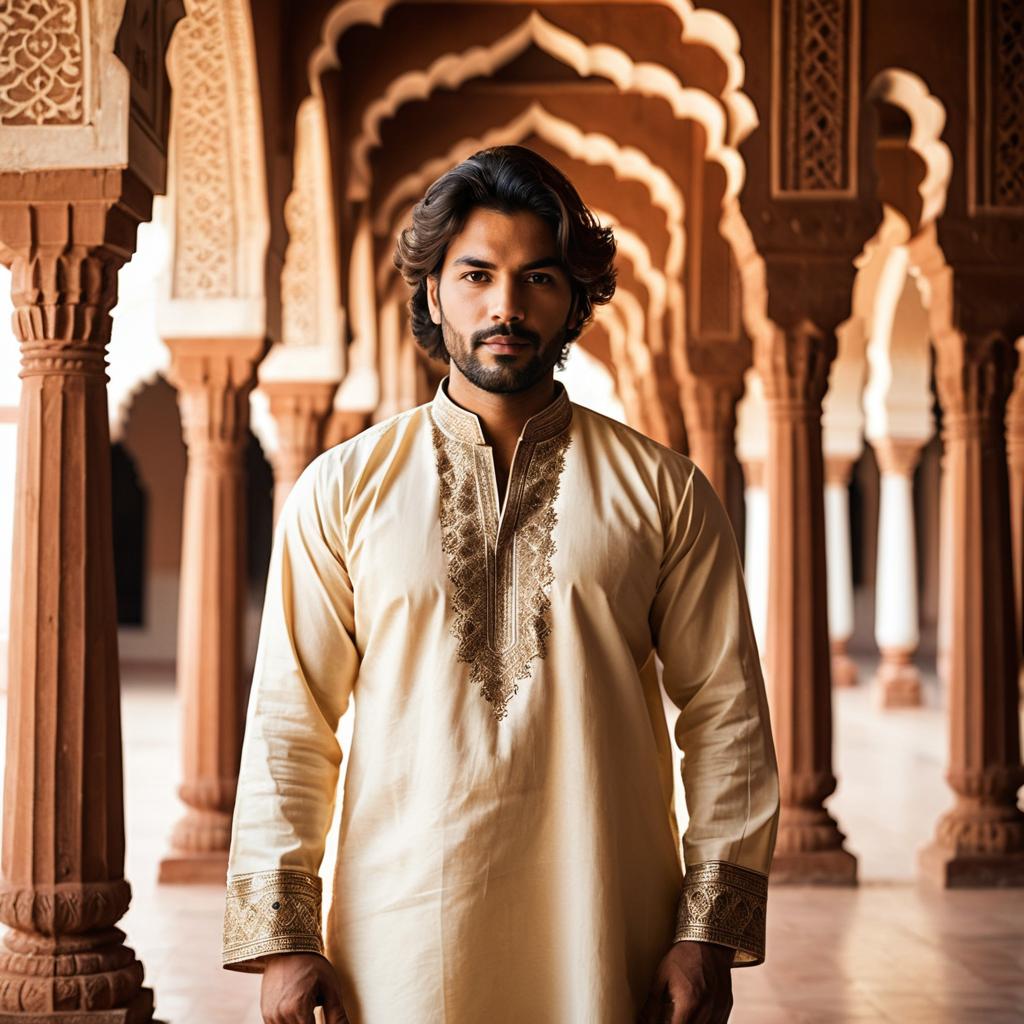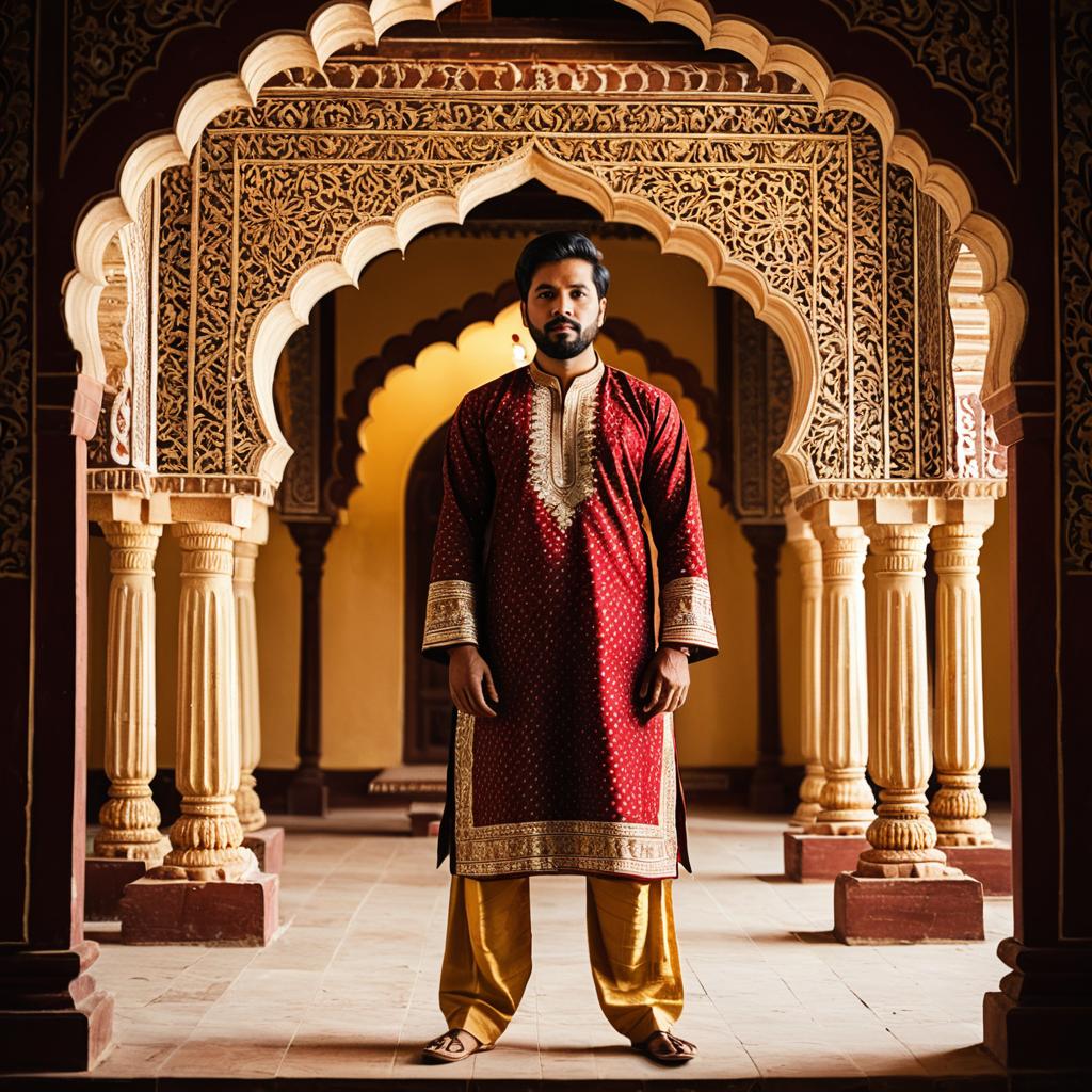 Royal jodhpuri suit wedding, photograph of a handsome Indian man standing, full body, traditional attire, golden mustard salwar kameez with intricate embroidery, red turban with decorative center piece, red pocket square, white pyjama, medium build, dark beard, medium skin tone, serious expression, background of ornate beige archway, daytime, realistic style, rich colors, cultural, traditional Indian clothing, elegant, detailed ures