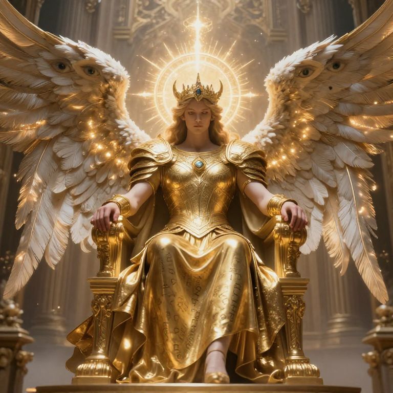 Biblical accurate angel depicted in a majestic throne room of heaven, multiple feathered wings covered in eyes, glowing ethereal aura, intricate golden armor with ancient script, powerful and mystical, hyper-realistic and cinematic lighting.