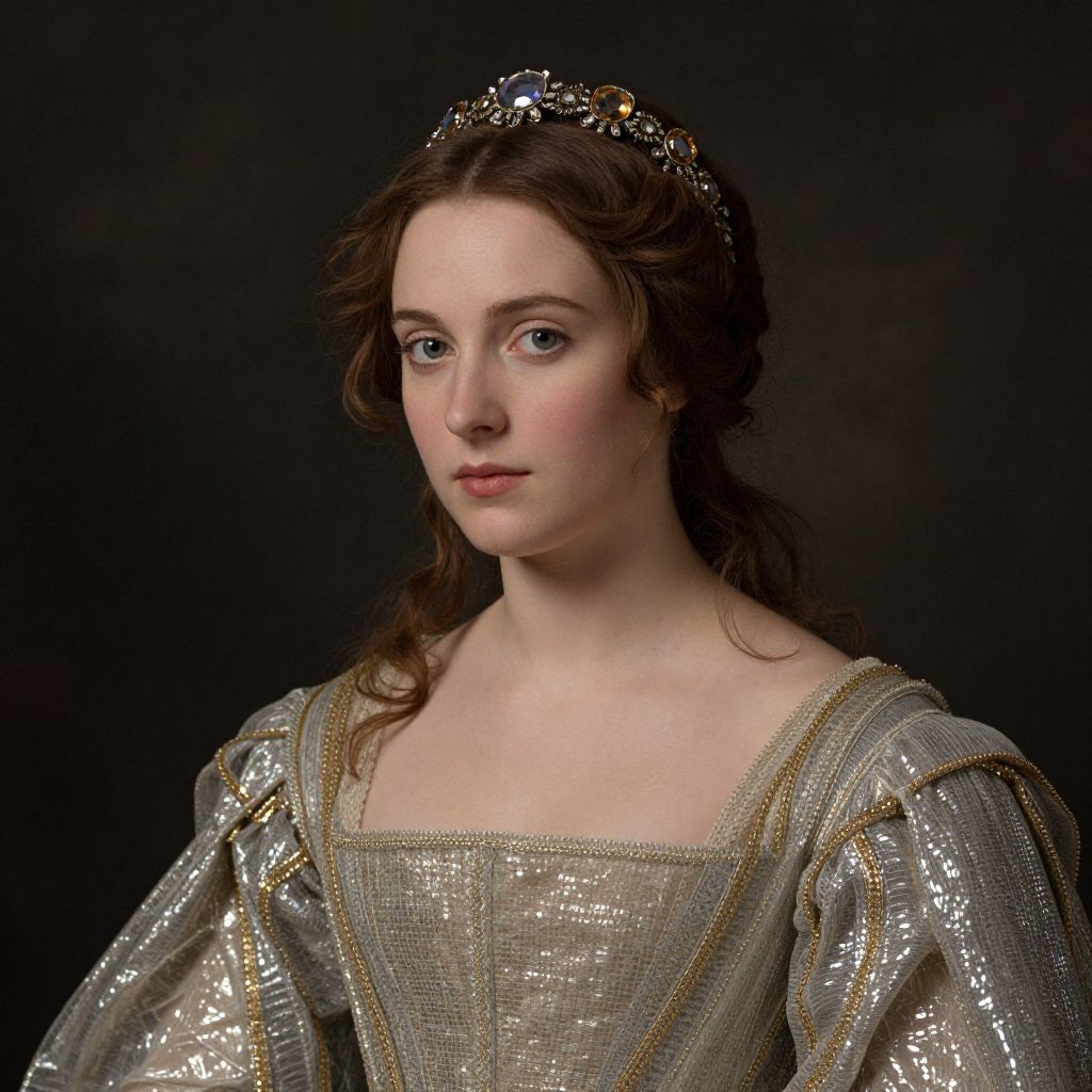 An artistic portrayal of a woman wearing a shimmering dress and a jeweled headband, set against a dark, textured background. The image has a classical, Renaissance-inspired style that showcases elegance and grace.