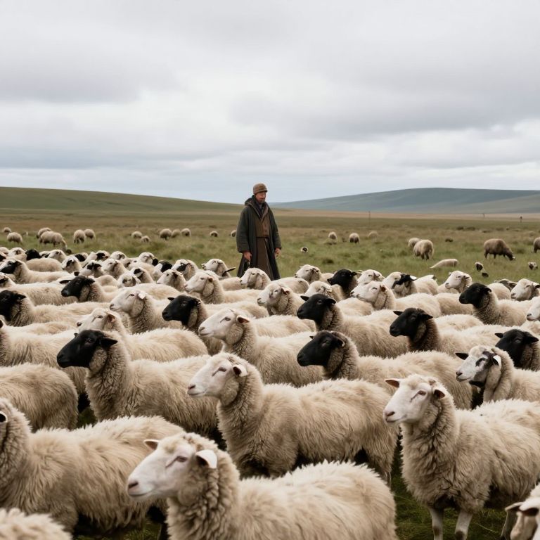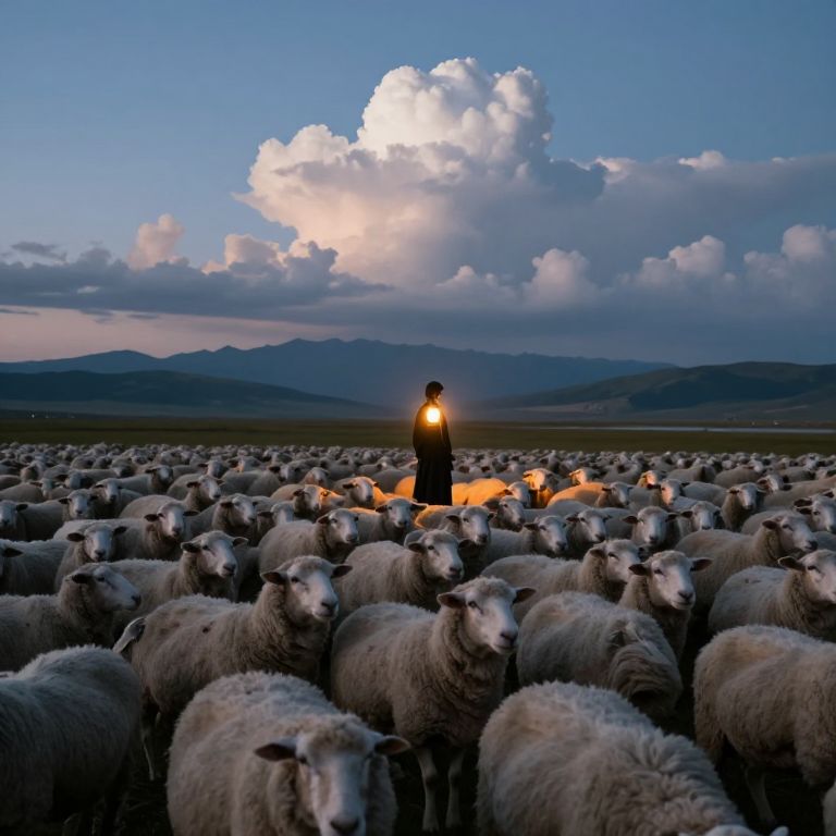 Shepherd stands tall in a golden field, draped in a vibrant red cloak and holding a wooden staff, as he guides a vast flock of fluffy white sheep beneath a serene sky dotted with cumulus clouds.
