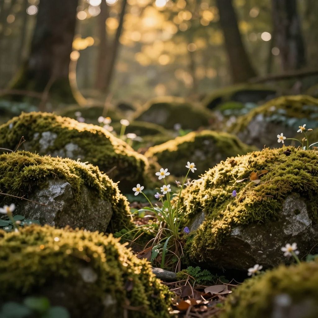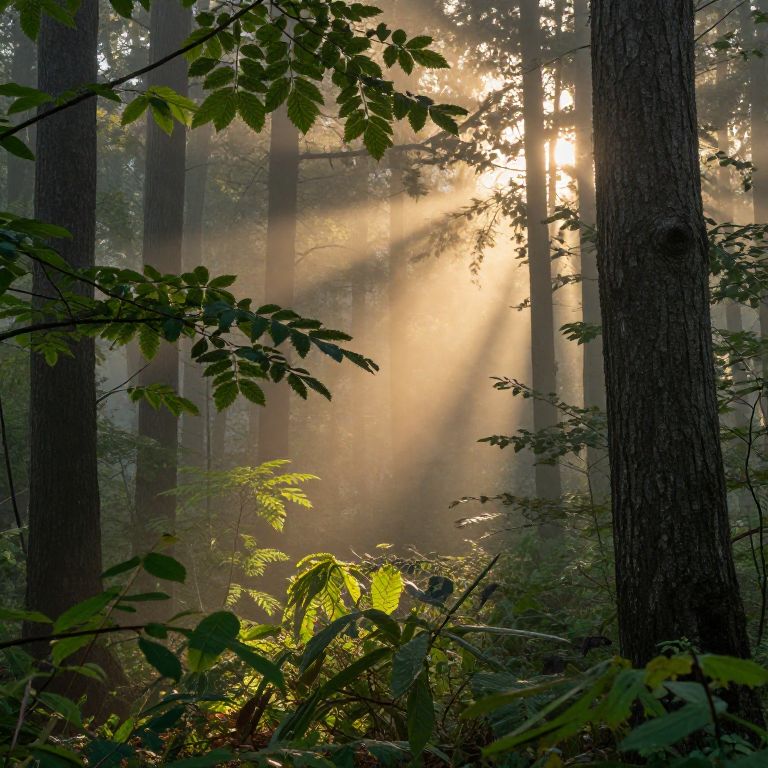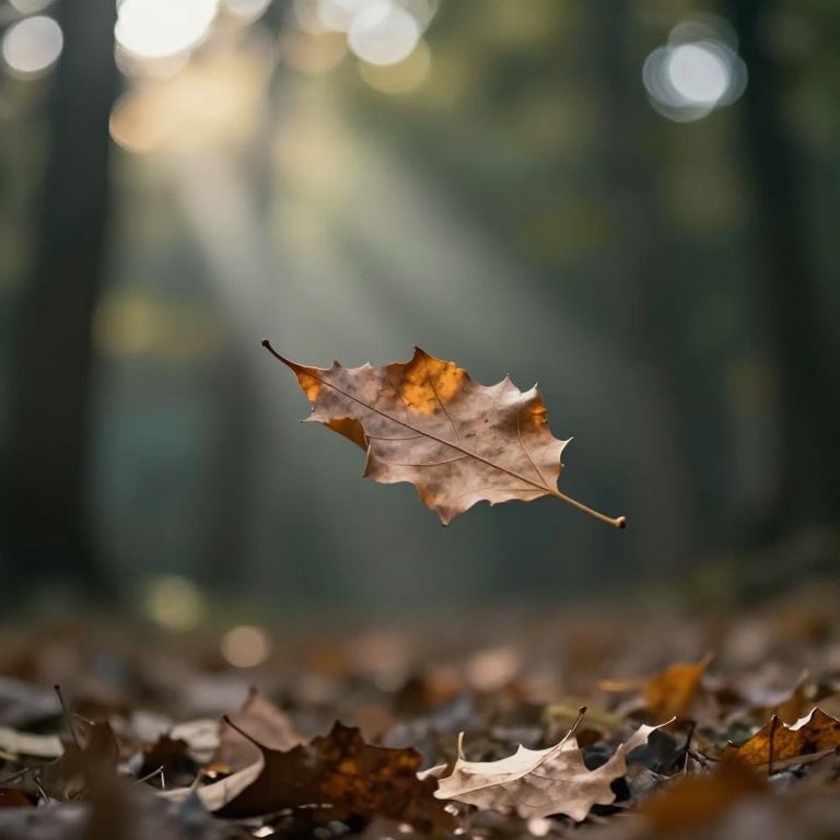 A falling leaf, caught in slow motion, suspended in the air with rays of sunlight穿透 through the trees, emphasizing the delicate movement and natural beauty.