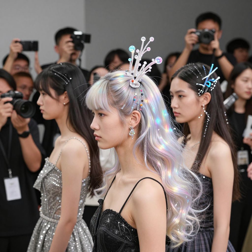 Ai hairstyle fashion runway scene, models featuring hairstyles augmented with animated holographic elements, shimmering hair with soft glows and tech-inspired ornamentation, crowd of tech enthusiasts and photographers with futuristic cameras