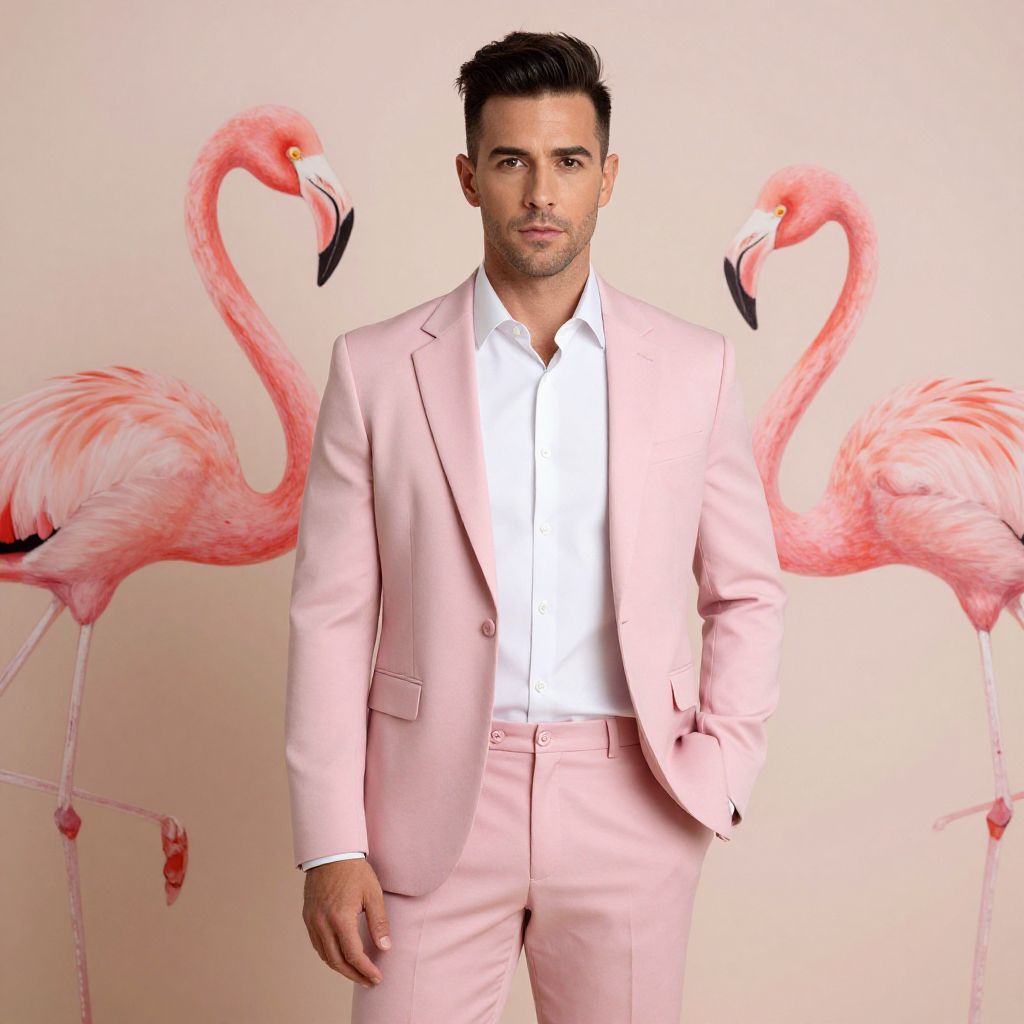 A stylish man poses confidently in a pink suit, matched impeccably with his surroundings that feature elegant flamingo drawings and a warm, artistic ambience.