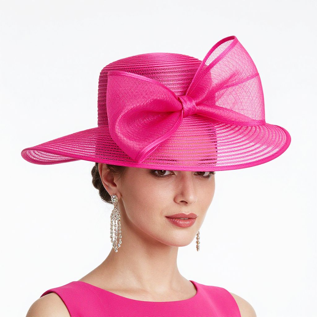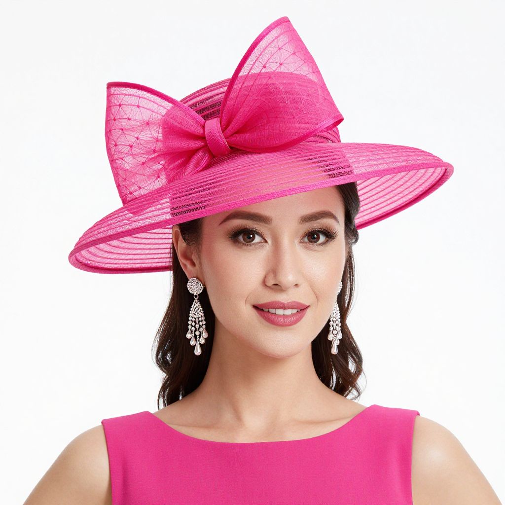 Photograph of a fair-skinned woman with brown hair, wearing a vibrant pink, wide-brimmed hat adorned with a large, translucent pink bow. She has dangling silver earrings and a matching pink sleeveless top. Her makeup includes pink lipstick. The background is pure white, making the pink hues of her hat and top stand out prominently. The hat's fabric has a slightly textured, woven pattern, and the bow is intricately tied. The woman's expression is calm and slightly smiling.