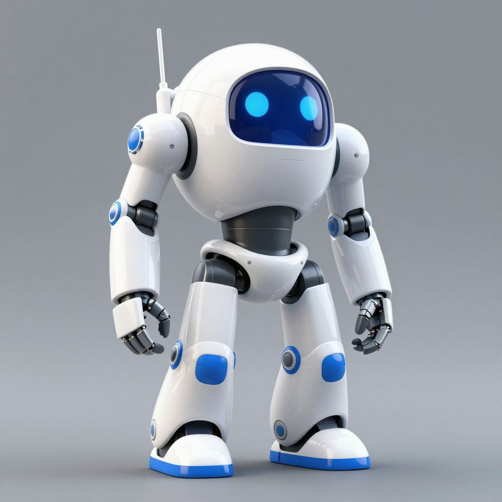 CGI image of a cute, white, robotic humanoid with blue glowing eyes, blue accents, and a sleek, futuristic design against a gray gradient background