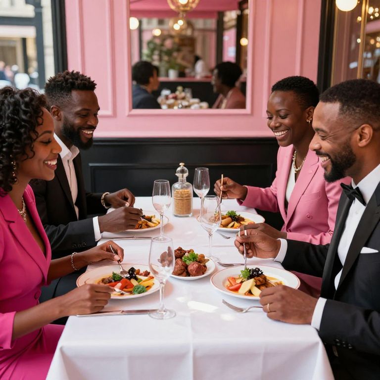 Photograph of four Black friends, elegantly dressed in formal attire, laughing and enjoying a gourmet meal at a chic, pink-walled restaurant.