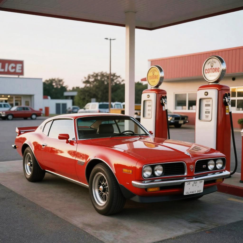 1986 red firebird in a vintage gas station setting, surrounded by classic signs and old fuel pumps, nostalgic atmosphere, detailed textures on car body and environment, soft afternoon light