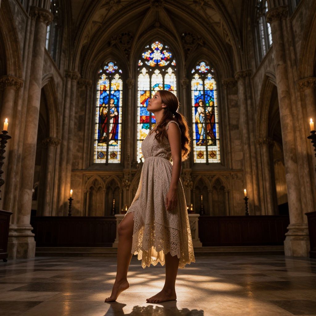 Photograph of a young woman in a lace dress, standing in a sunlit, Gothic cathedral, gazing up at vibrant stained glass windows.