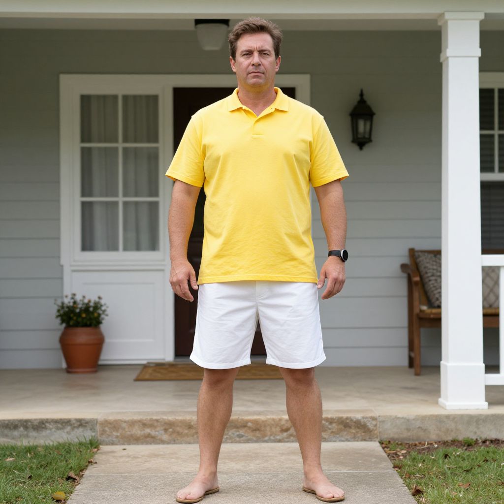 Photograph of a middle-aged Caucasian man with short brown hair, standing on a concrete path in front of a light gray house with white trim. He wears a bright yellow polo shirt, white knee-length shorts, and brown flip-flops. A black watch is visible on his left wrist. The background features a white door with glass panes, a black lantern, a wooden chair with a cushion, and a potted plant. The grass on either side of the path is slightly overgrown. The man stands with a neutral expression, looking directly at the camera. The overall setting is suburban.